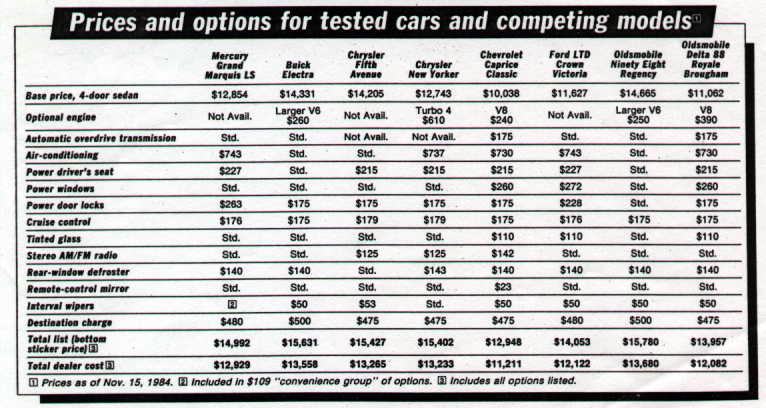 | Air-conditioning. (excellent) The optional air conditioner responded quickly to changes in its temperature setting. When outside temperatures are 40F or higher, the air conditioner works in "defrost" to keep windows free of fog. | Air-conditioning. (excellent) It's standard in the Electra, and it worked flawlessly. When outside temperatures are above 50F and the defroster is on, the air conditioner automatically switches on to keep windows free of fog. | Air-conditioning. (excellent) Standard in the Fifth Avenue; it worked flawlessly. |